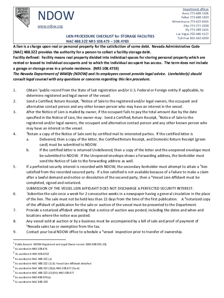 NOW www.ndow.orgDepartment offices Reno 7756881506 Fallon 7756881820 Winnemucca 7756236565 Elk 7757772300 Fly 7752891655 Las Vegas 7024865127 Toll Free 8555426369LIEN PROCEDURE CHECKLIST for STORAGE