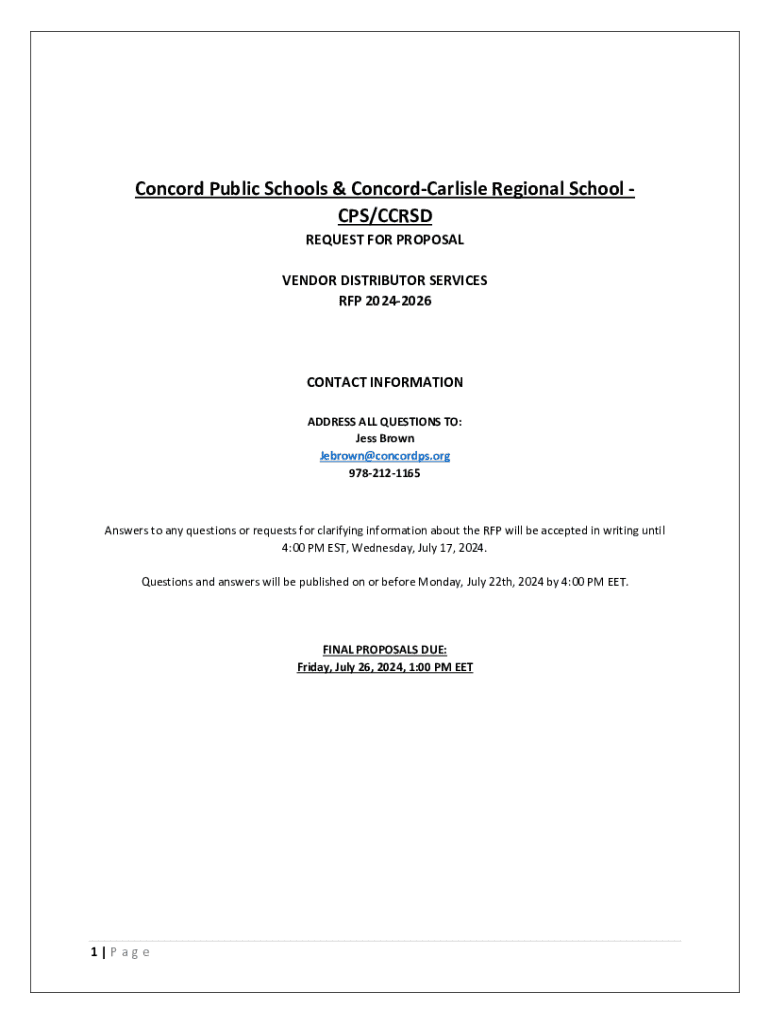 Concord Public Schools & ConcordCarlisle Regional School CPS/CCR SD REQUEST FOR PROPOSAL VENDOR DISTRIBUTOR SERVICES RFP 20242026CONTACT INFORMATION ADDRESS ALL QUESTIONS TO: Jess Brown Jebrown@concordps.org