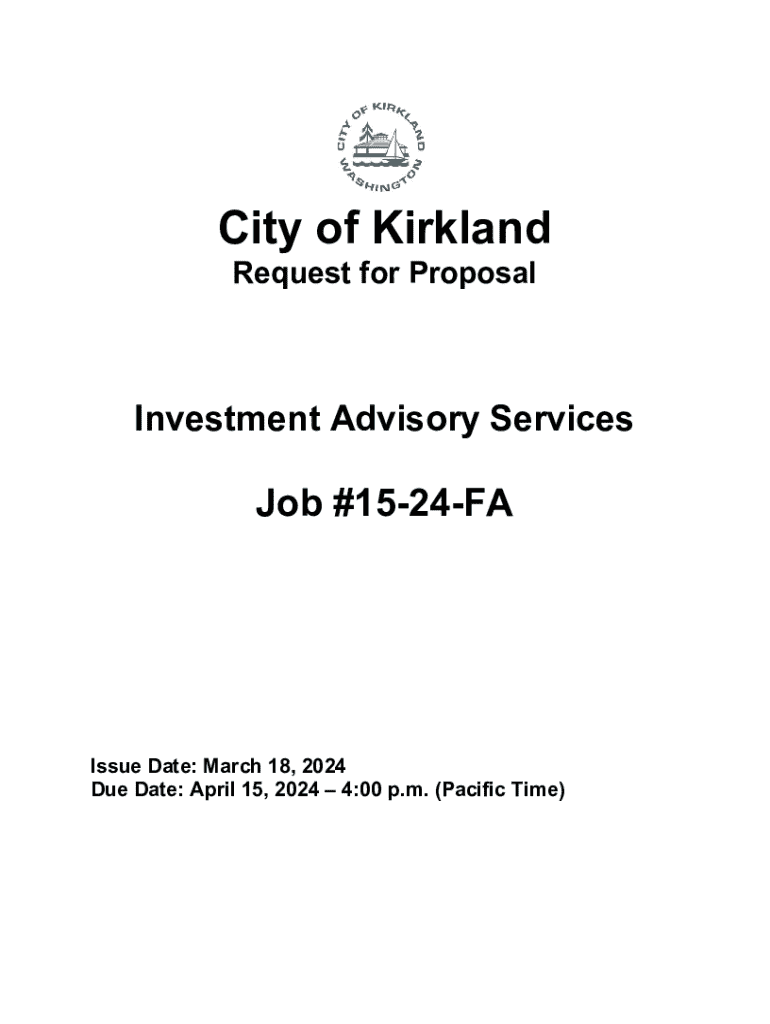 City of Kirkland Request for ProposalInvestment Advisory Services Job #1524FAIssue Date: March 18, 2024, Due Date: April 15, 2024 4:00 p.m. (Pacific Time)REQUEST FOR PROPOSALS Notice is hereby given