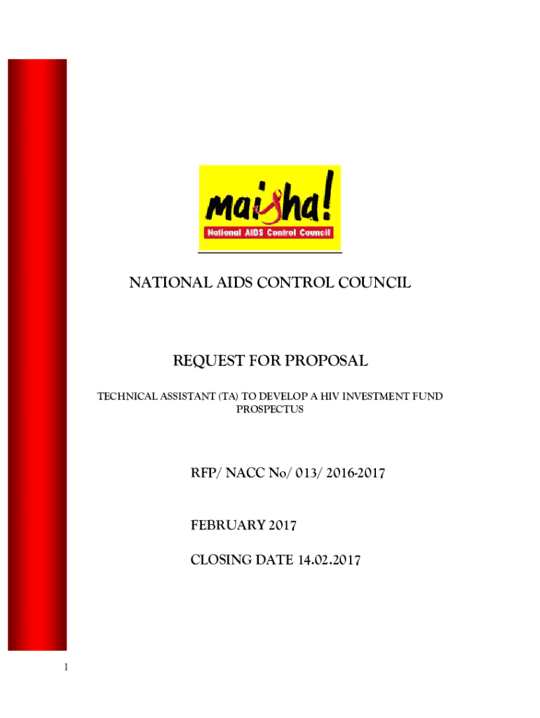 NATIONAL AIDS CONTROL COUNCILREQUEST FOR PROPOSAL TECHNICAL ASSISTANT (TA) TO DEVELOP A HIV INVESTMENT FUND PROSPECTUS RFP/ NAC No/ 013/ 20162017 FEBRUARY 2017 CLOSING DATE 14.02.20171Contents SECTION