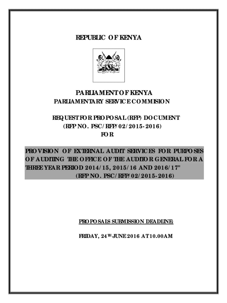 REPUBLIC OF KENYAPARLIAMENT OF KENYA PARLIAMENTARY SERVICE COMMISSION REQUEST FOR PROPOSAL (RFP) DOCUMENT (RFP NO. PSC/RFP/02/20152016) FOR PROVISION OF EXTERNAL AUDIT SERVICES FOR PURPOSES OF AUDITING