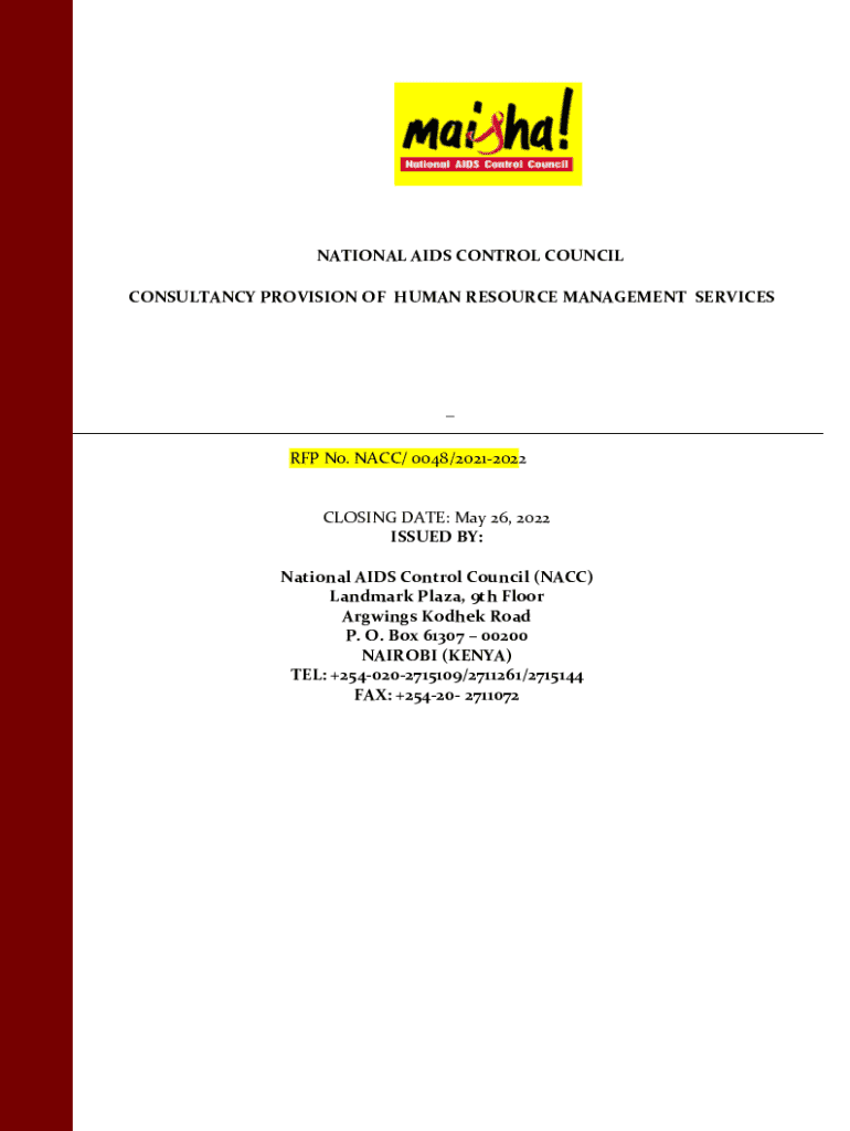 NATIONAL AIDS CONTROL COUNCIL CONSULTANCY PROVISION OF HUMAN RESOURCE MANAGEMENT SERVICES_ RFP No. NAC/ 0048/20212022CLOSING DATE: May 26, 2022, ISSUED BY: National AIDS Control Council (NAC) Landmark
