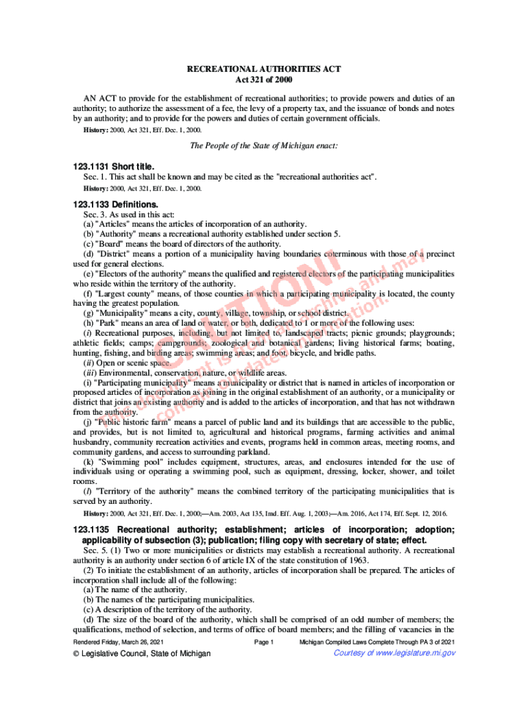 RECREATIONAL AUTHORITIES ACT Act 321 of 2000 AN ACT to provide for the establishment of recreational authorities; to provide powers and duties of an authority; to authorize the assessment of a fee,