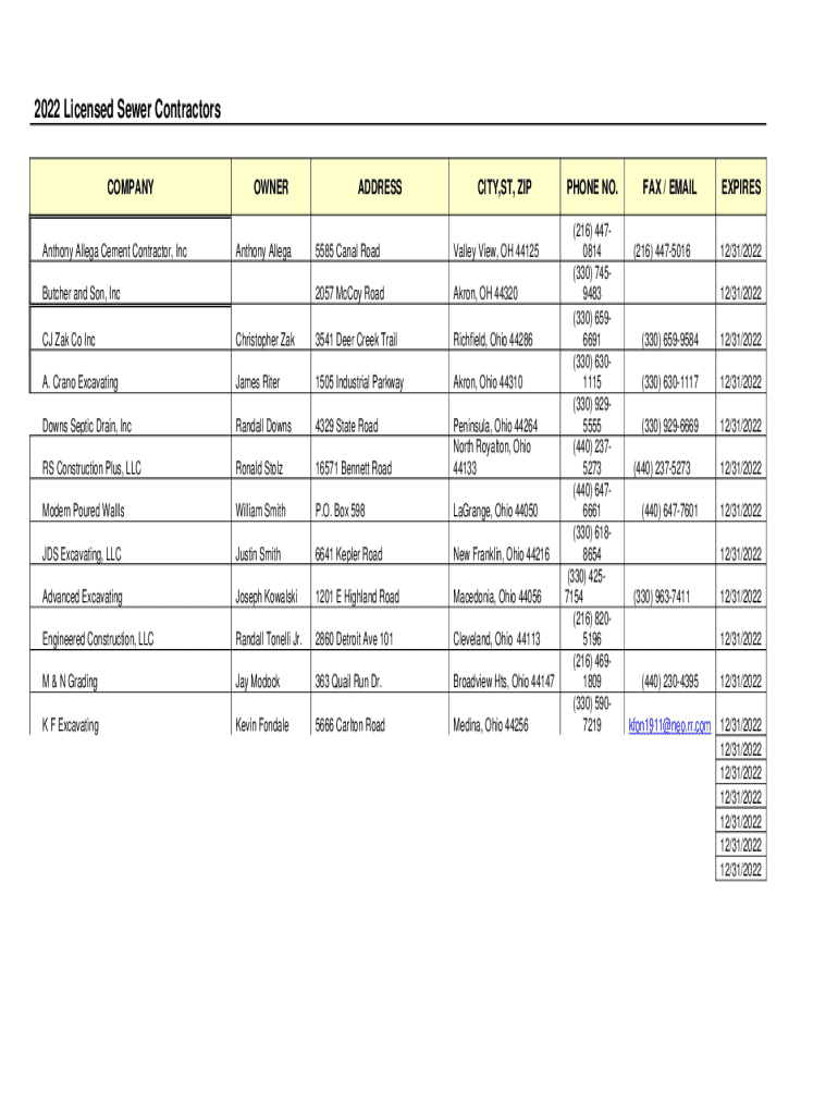 2022 Licensed Sewer Contractors COMPANY Anthony Allega Cement Contractor, IncOWNER Anthony AllegaButcher and Son, IncADDRESSCITY,ST, ZIP5585 Canal RoadValley View, OH 441252057 McCoy RoadAkron, OH