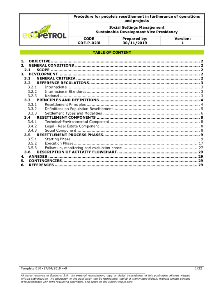 Procedure for people\'s resettlement in furtherance of operations and projects Social Settings Management Sustainable Development Vice Presidency CODE GDEP023iPrepared by: 30/11/2019Version: 1TABLE