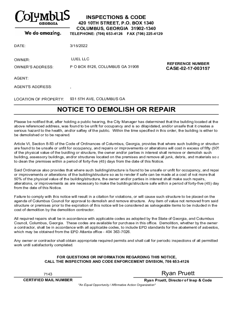 Get the free NOTICE TO DEMOLISH OR REPAIR
