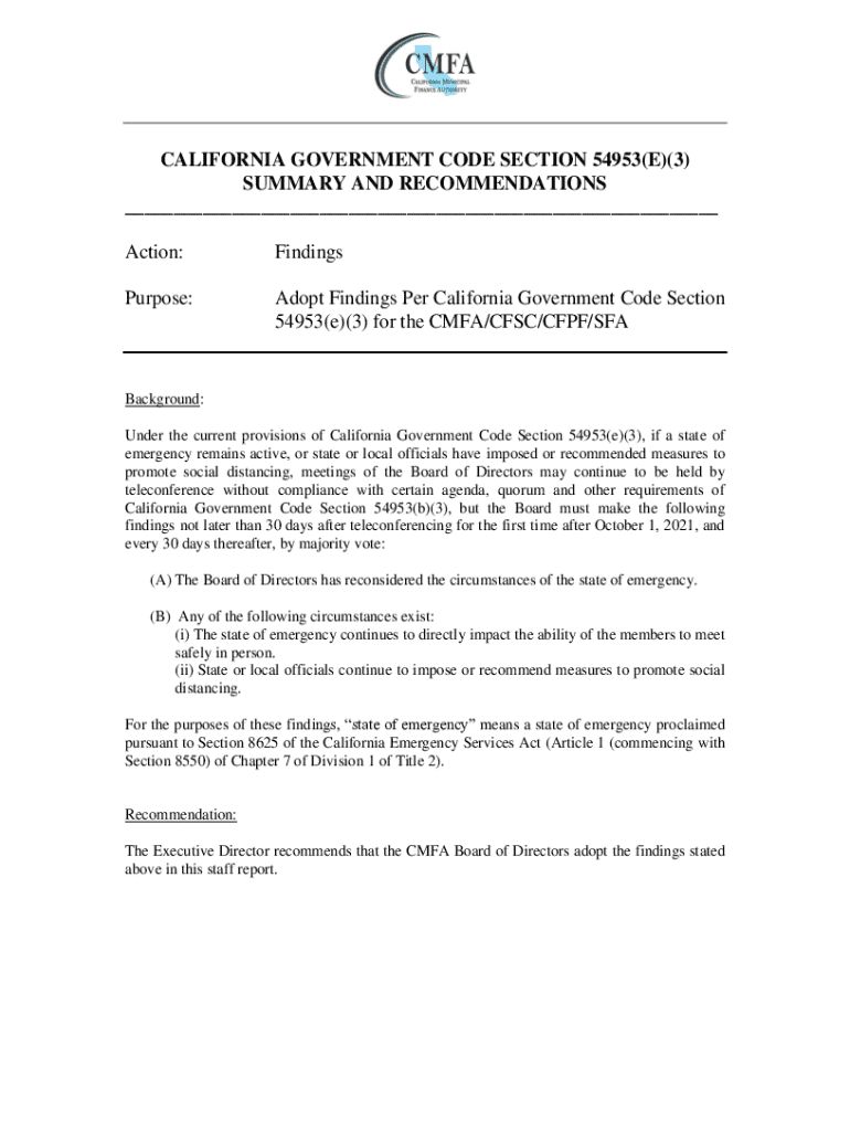 CALIFORNIA GOVERNMENT CODE SECTION 54953(E)(3) SUMMARY AND RECOMMENDATIONS ___ Action:FindingsPurpose:Adopt Findings Per California Government Code Section 54953(e)(3) for the CMFA/CFSC/CFPF/SFABackground: