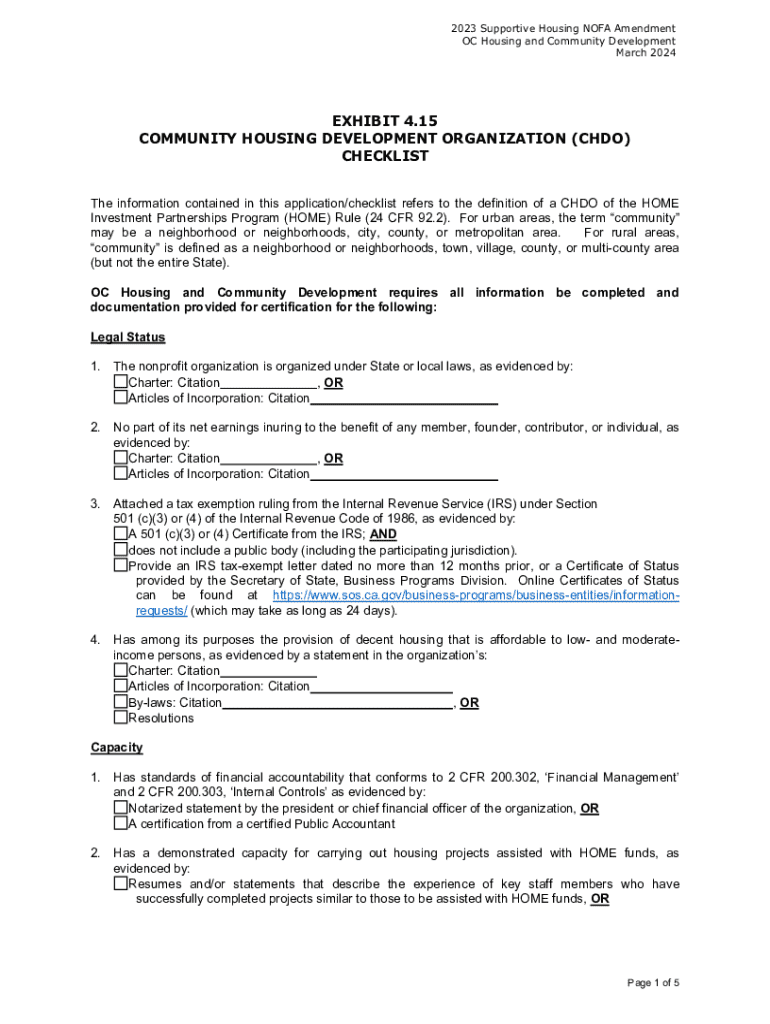2023 Supportive Housing NOFA Amendment OC Housing and Community Development March 2024EXHIBIT 4.15 COMMUNITY HOUSING DEVELOPMENT ORGANIZATION (CHDO) CHECKLIST The information contained in this application/checklist