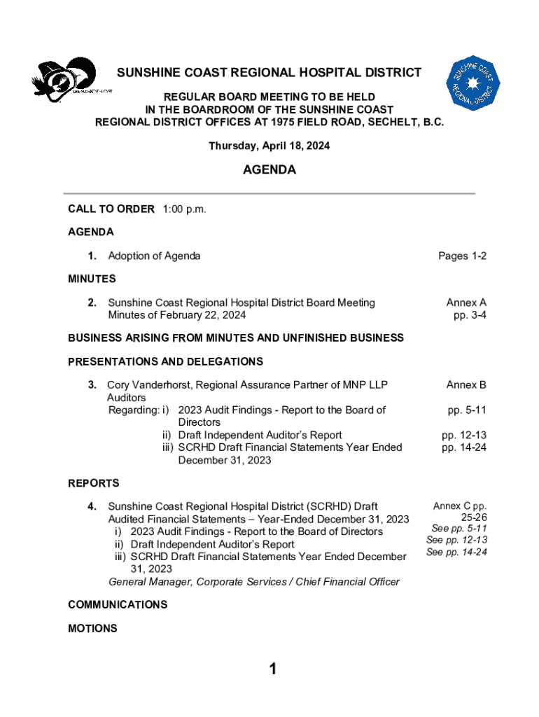 SUNSHINE COAST REGIONAL HOSPITAL DISTRICT REGULAR BOARD MEETING TO BE HELD IN THE BOARDROOM OF THE SUNSHINE COAST REGIONAL DISTRICT OFFICES AT 1975 FIELD ROAD, SECRET, B.C. Thursday, April 18, 2024AGENDA