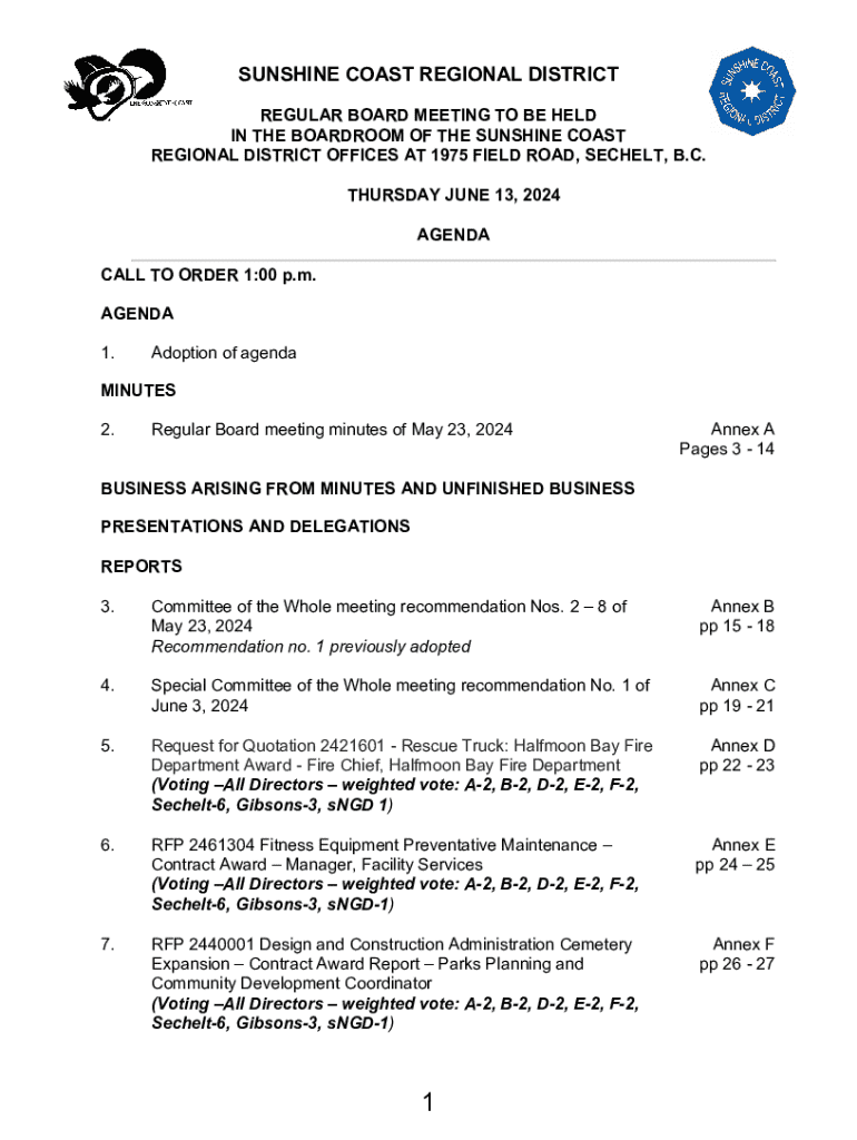 SUNSHINE COAST REGIONAL DISTRICT REGULAR BOARD MEETING TO BE HELD IN THE BOARDROOM OF THE SUNSHINE COAST REGIONAL DISTRICT OFFICES AT 1975 FIELD ROAD, SECRET, B.C. THURSDAY, JUNE 13, 2024, AGENDA