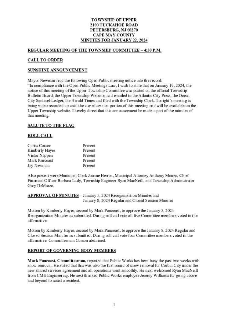 TOWNSHIP OF UPPER 2100 TUCKAHOE ROAD PETERSBURG, NJ 08270 CAPE MAY COUNTY MINUTES FOR JANUARY 22, 2024, REGULAR MEETING OF THE TOWNSHIP COMMITTEE 4:30 P.M. CALL TO ORDER SUNSHINE ANNOUNCEMENT Mayor