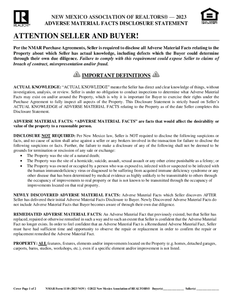 NEW MEXICO ASSOCIATION OF REALTORS 2023 ADVERSE MATERIAL FACTS DISCLOSURE STATEMENTATTENTION SELLER AND BUYER! Per the NEAR Purchase Agreements, Seller is required to disclose all Adverse Material