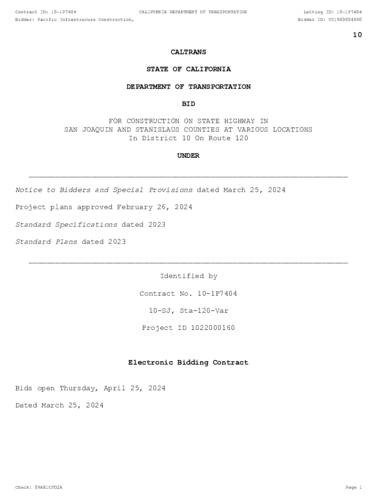 Contract ID: 101P7404CALIFORNIA DEPARTMENT OF TRANSPORTATIONBidder: Pacific Infrastrucure Construction, LLCLetting ID: 101P7404 Bidder ID: VC150000496010 CALTRANS STATE OF CALIFORNIA DEPARTMENT OF