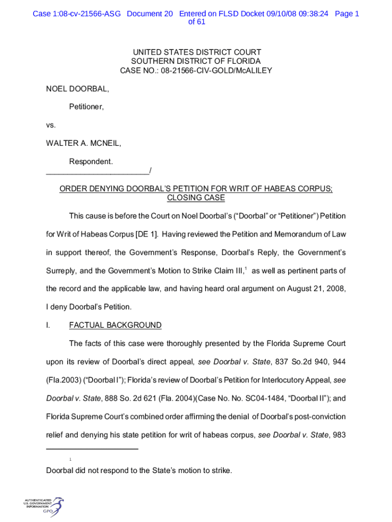 Case 1:08cv21566ASG Document 20 Entered on FLED Docket 09/10/08 09:38:24-Page 1 of 61UNITED STATES DISTRICT COURT SOUTHERN DISTRICT OF FLORIDA CASE NO.: 0821566CIVGOLD/McAllen NOEL DORSAL, Petitioner,
