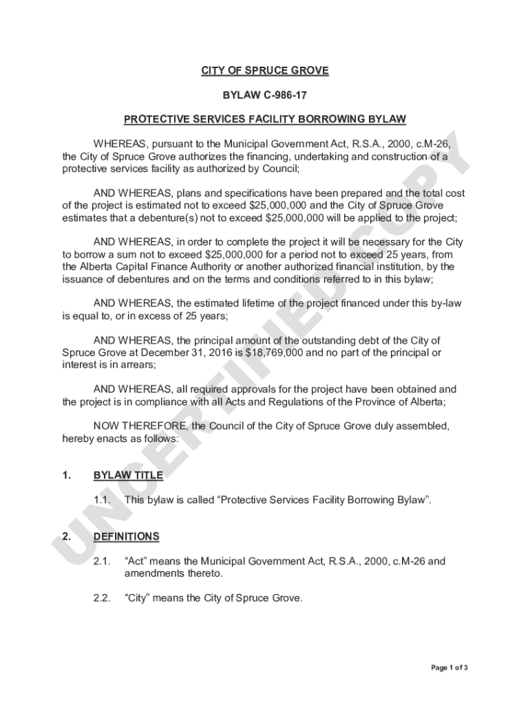 CITY OF SPRUCE GROVE BYLAW C98617 PROTECTIVE SERVICES FACILITY BORROWING BYLAWS O P WHEREAS, pursuant to the Municipal Government Act, R.S.A., 2000, c. M26, the City of Spruce Grove authorizes the