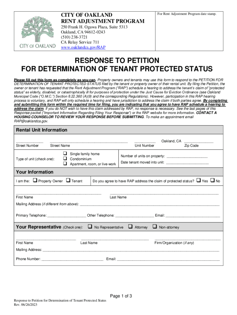 For Rent Adjustment Program date stamp. CITY OF OAKLAND RENT ADJUSTMENT PROGRAM 250 Frank H. Ottawa Plaza, Suite 5313 Oakland, CA 946120243 (510) 2383721 CA Relay Service 711 www.oaklandca.gov/RAPRESPONSE