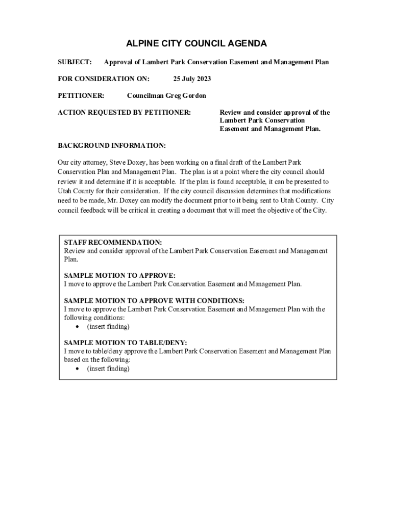 ALPINE CITY COUNCIL AGENDA SUBJECT:Approval of Lambert Park Conservation Easement and Management Platform CONSIDERATION ON: PETITIONER:25 July 2023Councilman Greg Coronation REQUESTED BY PETITIONER:Review