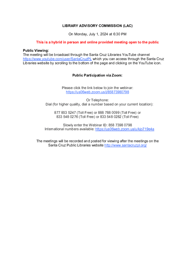 LIBRARY ADVISORY COMMISSION (LAC) On Monday, July 1, 2024, at 6:30 PM This is a hybrid in person and online provided meeting open to the public Viewing: The meeting will be broadcast through the Santa