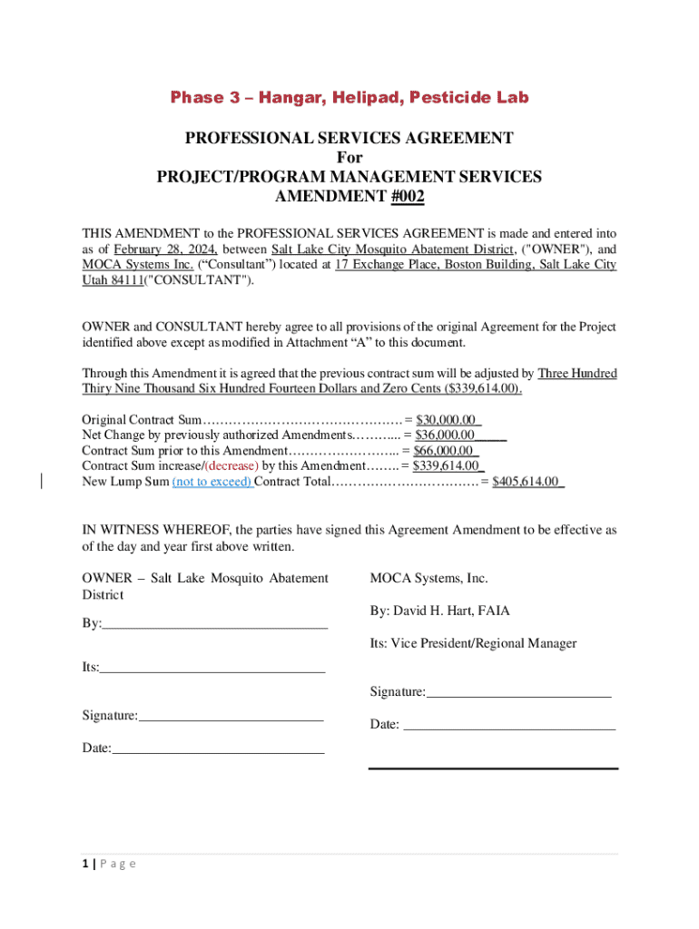 Phase 3 Hangar, Helipad, Pesticide Subprofessional SERVICES AGREEMENT For PROJECT/PROGRAM MANAGEMENT SERVICES AMENDMENT #002 THIS AMENDMENT to the PROFESSIONAL SERVICES AGREEMENT is made and entered