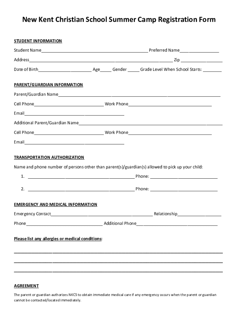 New Kent Christian School Summer Camp Registration Form STUDENT INFORMATION Student Name___ Preferred Name___ Address___ Zip ___ Date of Birth___ Age___ Gender ___ Grade Level When School Starts: