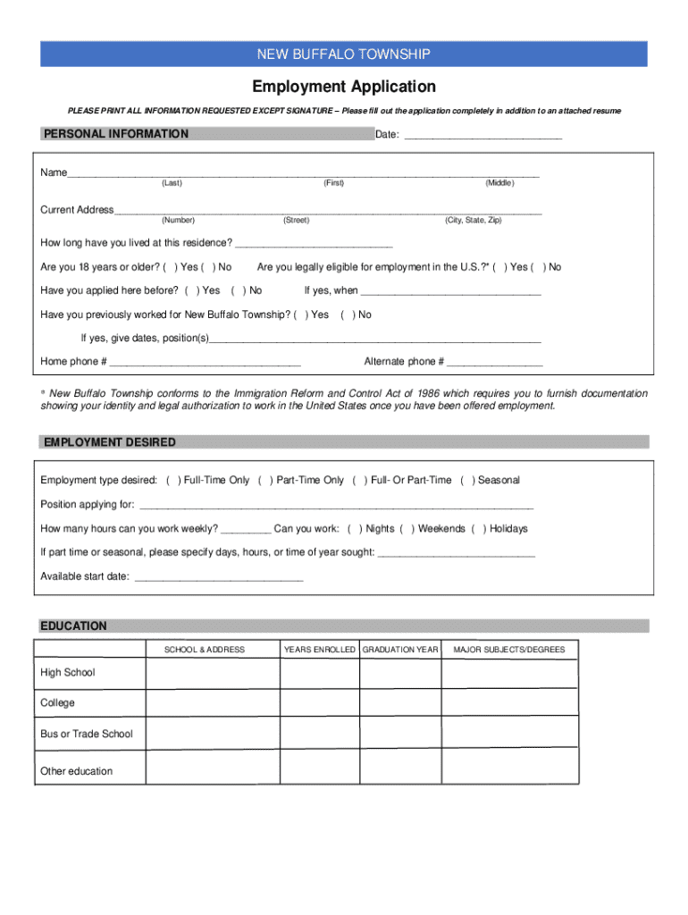 NEW BUFFALO TOWNSHIPEmployment Application PLEASE PRINT ALL INFORMATION REQUESTED EXCEPT SIGNATURE Please fill out the application completely in addition to an attached resumePERSONAL Informational: