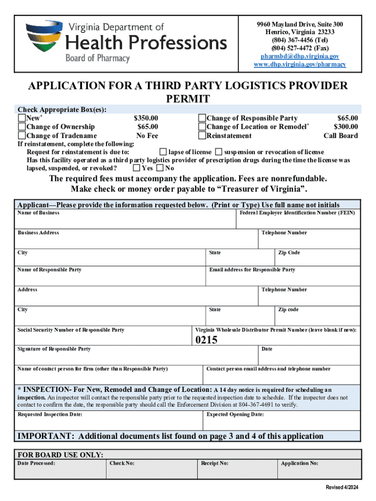 www.dhp.virginia.gov/pharmacyAPPLICATION FOR A THIRD PARTY LOGISTICS PROVIDER