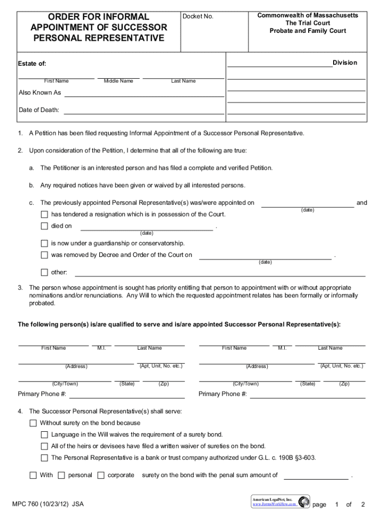 ORDER FOR INFORMAL APPOINTMENT OF SUCCESSOR PERSONAL REPRESENTATIVE Commonwealth of Massachusetts The Trial Court Probate and Family CourtDocket No. DivisionEstate of: First NameMiddle Nameless Names