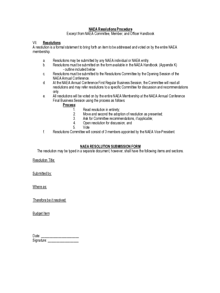 NASA Resolutions Procedure Excerpt from NASA Committee, Member, and Officer Handbook VII. Resolutions A resolution is a formal statement to bring forth an item to be addressed and voted on by the