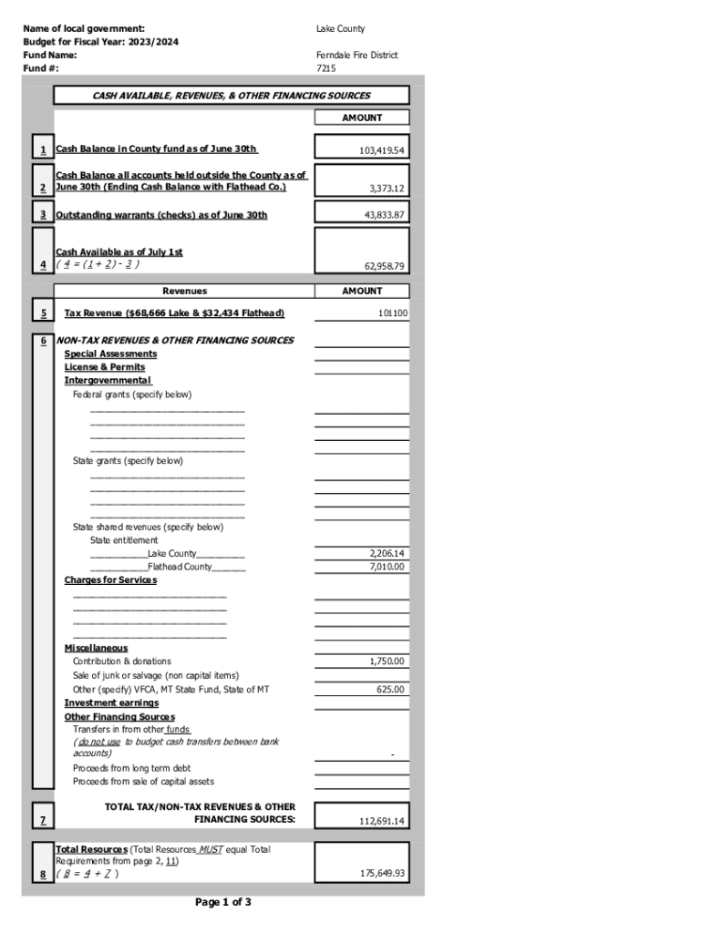 Name of local government: Budget for Fiscal Year: 2023/2024 Fund Name: Fund #:Lake County Ferndale Fire District 7215CASH AVAILABLE, REVENUES, & OTHER FINANCING SOURCES AMOUNT1 Cash Balance in County