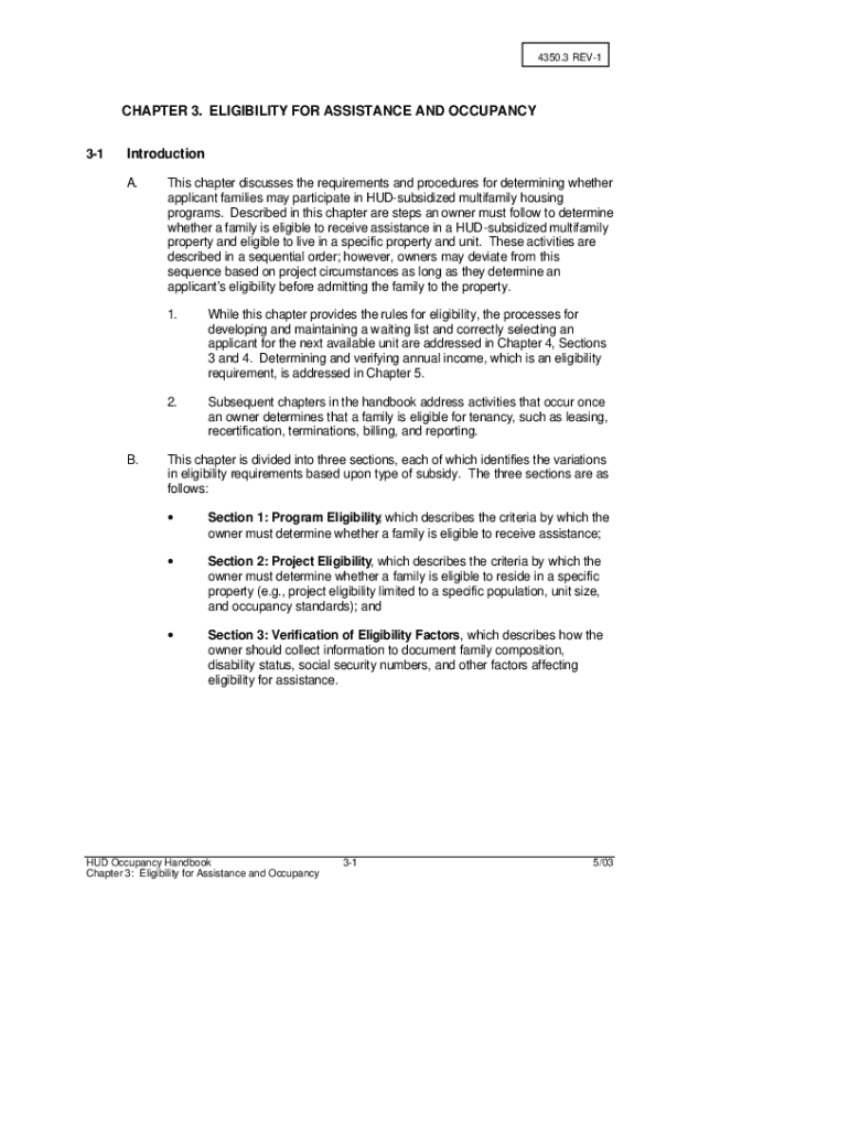 4350.3 REV1CHAPTER 3. ELIGIBILITY FOR ASSISTANCE AND OCCUPANCY 31Introduction A.B.This chapter discusses the requirements and procedures for determining whether applicant families may participate