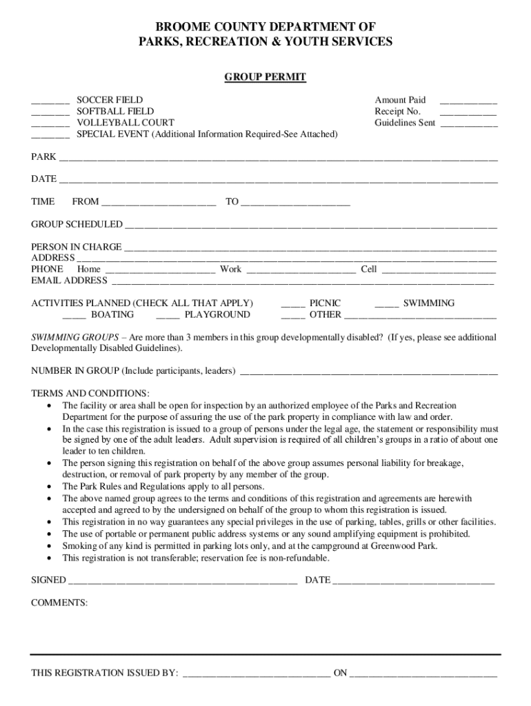 BROOKE COUNTY DEPARTMENT OF PARKS, RECREATION & YOUTH SERVICES GROUP PERMIT ___ ___ ___ ___SOCCER FIELD SOFTBALL FIELD VOLLEYBALL COURT SPECIAL EVENT (Additional Information Required Attached)Amount