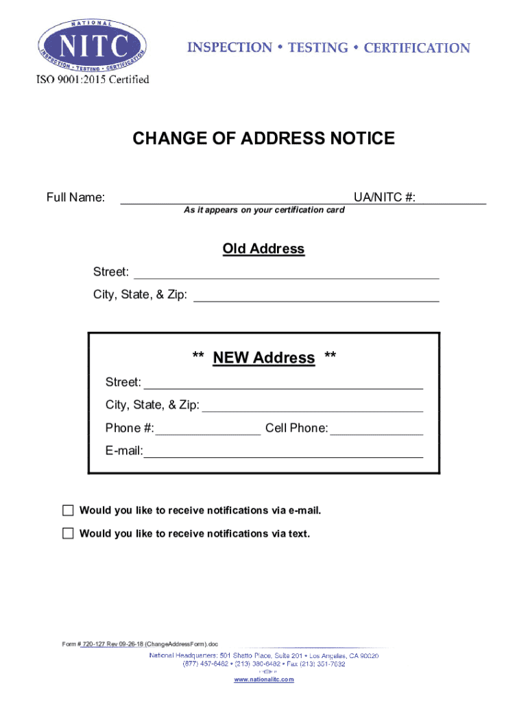 CHANGE OF ADDRESS NOTICE Full Name:As it appears on your certification Harold Address Street: City, State, & Zip:** NEW Address ** Street: City, State, & Zip: Phone #:Cell Phone:Email:Would you like