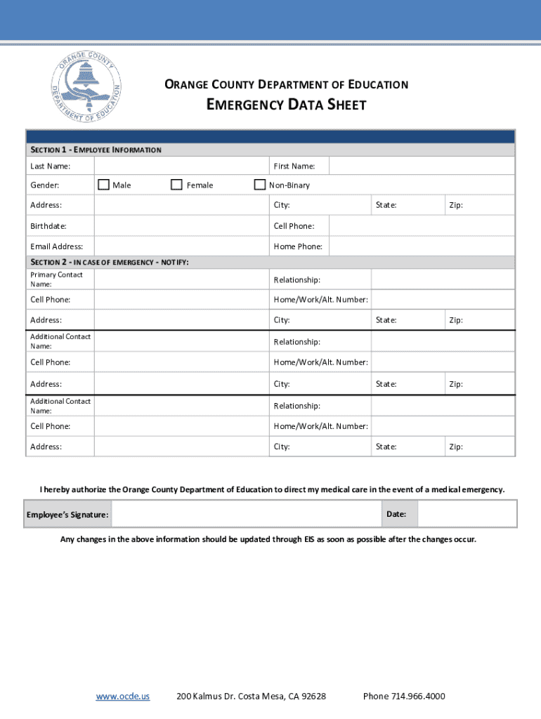 ORANGE COUNTY DEPARTMENT OF EDUCATION EMERGENCY DATA SHEET SECTION 1 EMPLOYEE INFORMATION Last Name: Gender:First Name: Male Female NonBinaryAddress:City:Birthdate:Cell Phone:Email Address:Home Phone:State:Zip:State:Zip:State:Zip:State:Zip:SECTION