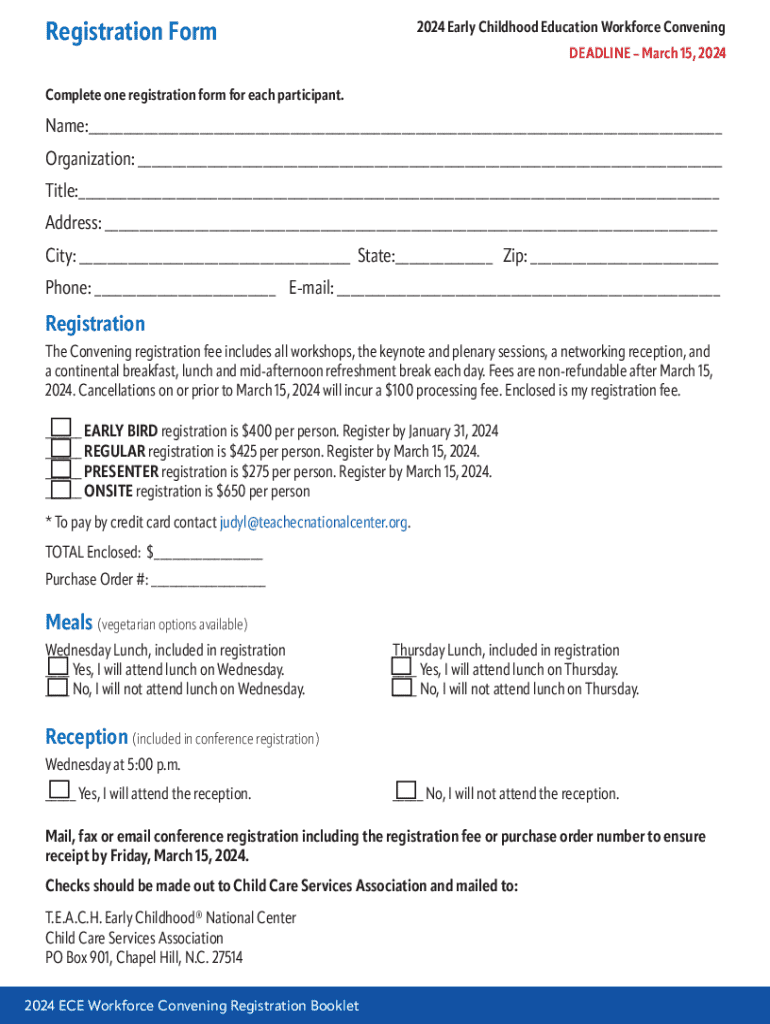 Registration Form2024 Early Childhood Education Workforce Convening DEADLINE March 15, 2024Complete one registration form for each participant. Name:___ Organization: ___ Title:___ Address: ___ City: