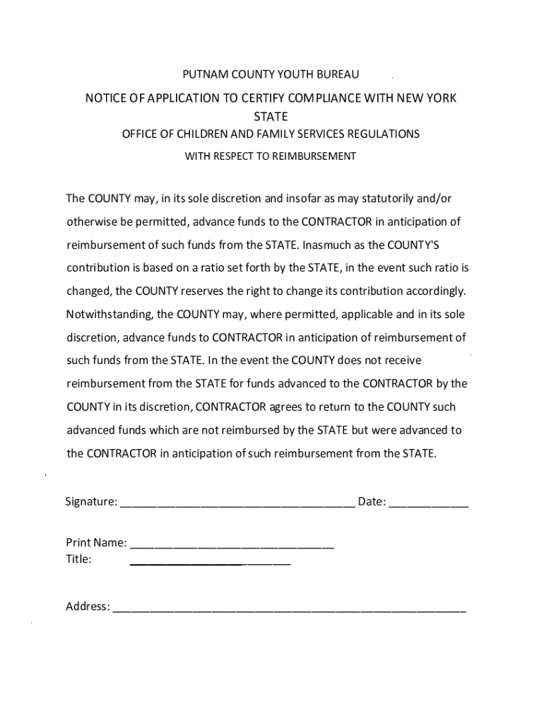 PUTNAM COUNTY YOUTH BUREAUNOTICE OF APPLICATION TO CERTIFY COMPLIANCE WITH NEW YORK STATE OFFICE OF CHILDREN AND FAMILY SERVICES REGULATIONS WITH RESPECT TO Reimbursement COUNTY may, in its sole discretion