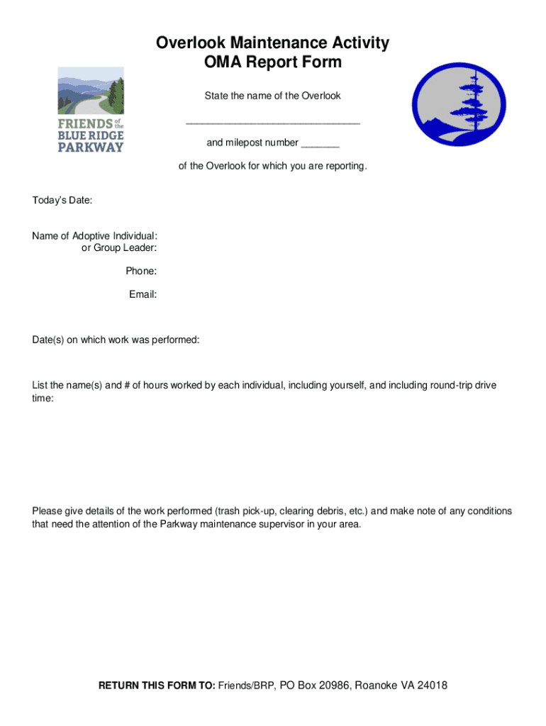 Overlook Maintenance Activity OMA Report Form State the name of the Overlook ___ and milepost number ___ of the Overlook for which you are reporting. Today's Date: Name of Adoptive Individual: or