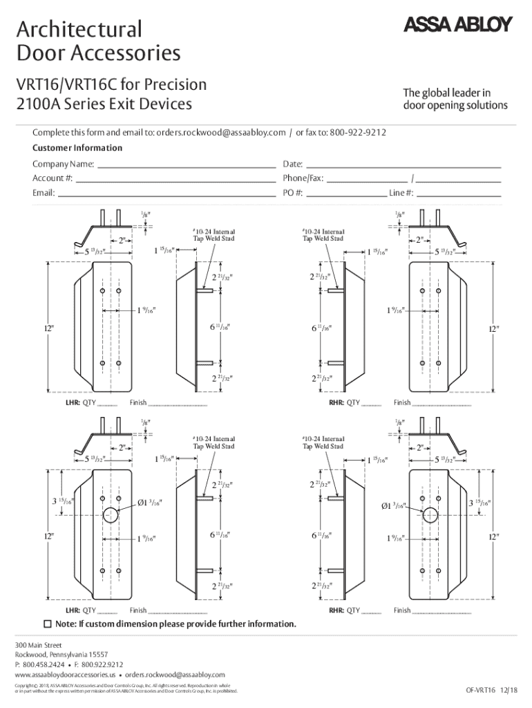 Architectural Door Accessories VRT16/VRT16C for Precision 2100A Series Exit Devices Complete this form and email to: orders.rockwood@assaabloy.com / or fax to: 8009229212 Customer Information Company
