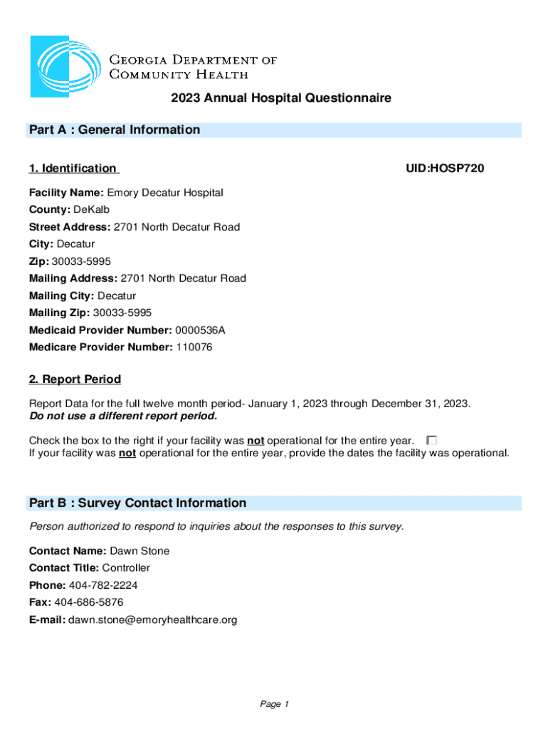 2023 Annual Hospital Questionnaire Part A : General Information 1. Identification:HOSP720Facility Name: Emory Decatur Hospital County: DeKalb Street Address: 2701 North Decatur Road City: Decatur
