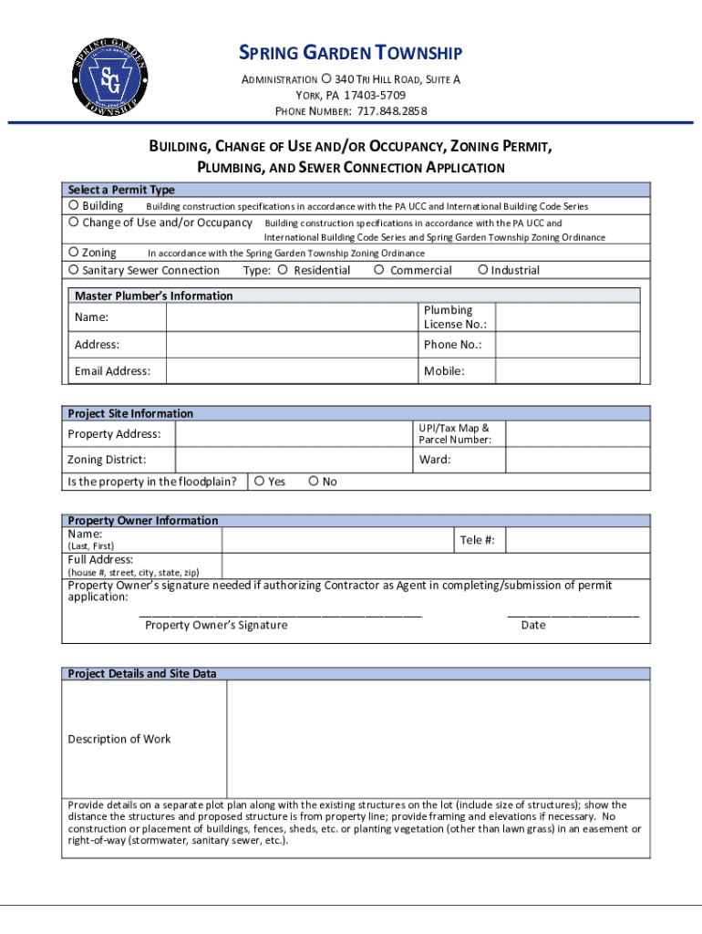 SPRING GARDEN TOWNSHIP ADMINISTRATION 340 TRI HILL ROAD, SUITE A YORK, PA 174035709 PHONE NUMBER: 717.848.2858BUILDING, CHANGE OF USE AND/OR OCCUPANCY, ZONING PERMIT, PLUMBING, AND SEWER CONNECTION