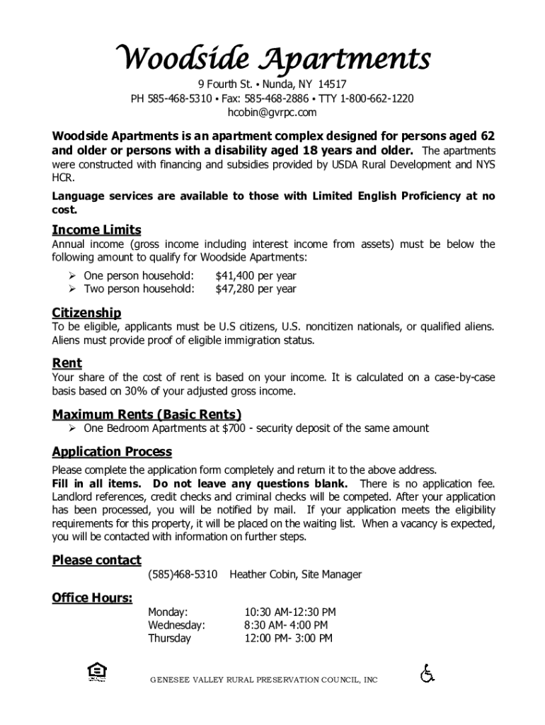 Woodside Apartments 9 Fourth St. Ñuñoa, NY 14517 PH 5854685310 Fax: 5854682886 TTY 18006621220 hcobin@gvrpc.comWoodside Apartments is an apartment complex designed for persons aged 62 and older
