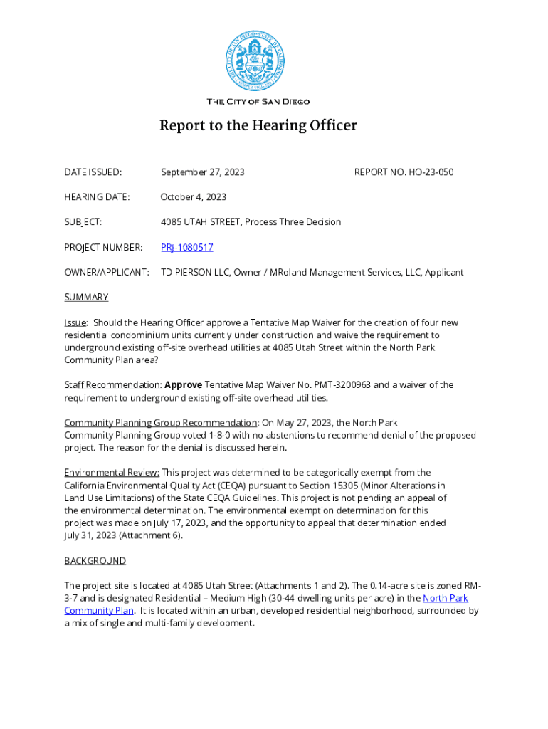 DATE ISSUED:September 27, 2023REPORT NO. HO23050HEARING DATE:October 4, 2023SUBJECT:4085 UTAH STREET, Process Three DecisionPROJECT NUMBER:PRJ1080517OWNER/APPLICANT:TD PIERSON LLC, Owner / Roland
