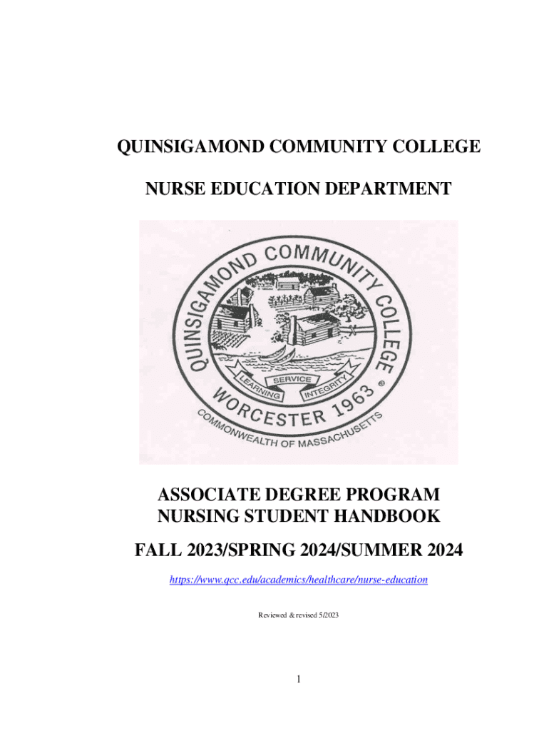 QUINSIGAMOND COMMUNITY COLLEGE NURSE EDUCATION DEPARTMENTASSOCIATE DEGREE PROGRAM NURSING STUDENT HANDBOOK FALL 2023/SPRING 2024/SUMMER 2024 https://www.qcc.edu/academics/healthcare/nurseeducation