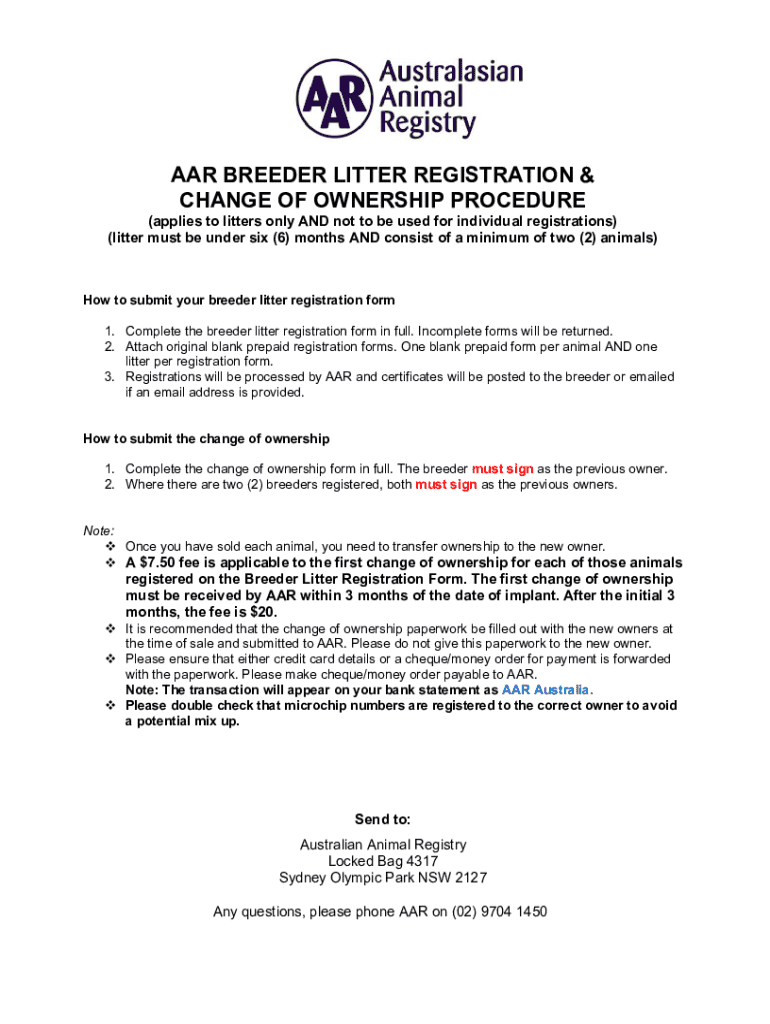 AAR BREEDER LITTER REGISTRATION & CHANGE OF OWNERSHIP PROCEDURE (applies to litter only AND not to be used for individual registrations) (litter must be under six (6) months AND consist of a minimum
