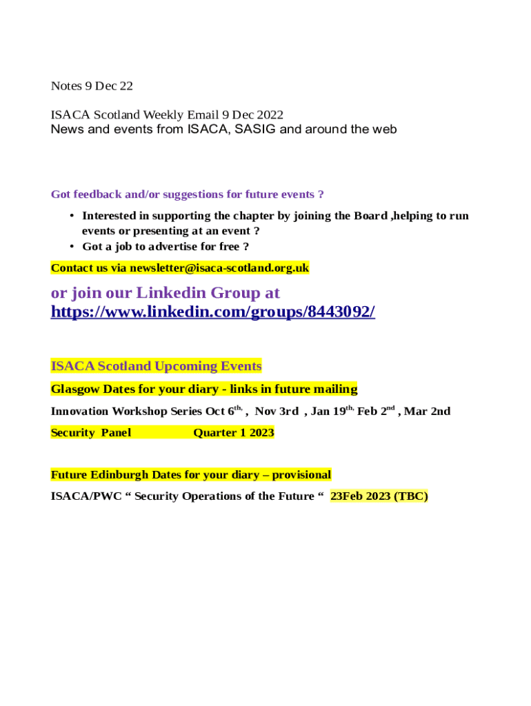 Notes 9 Dec 22 ISACA Scotland Weekly Email 9 Dec 2022 News and events from ISACA, SA SIG and around the weight feedback and/or suggestions for future events ? Interested in supporting the chapter
