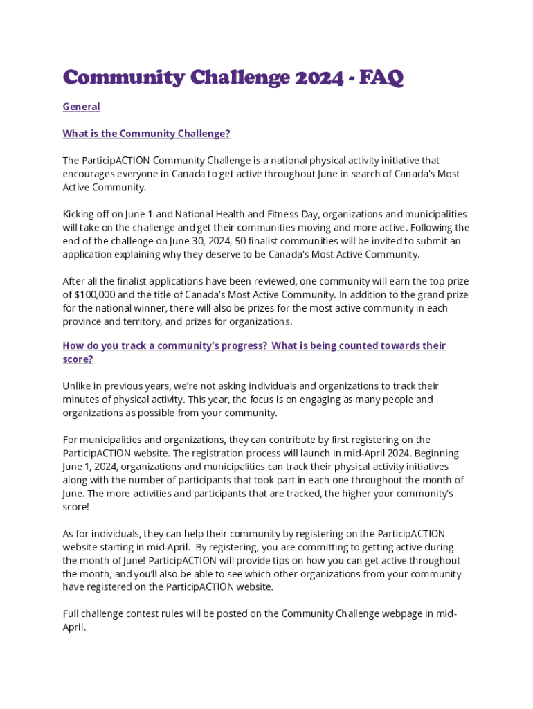 Community Challenge 2024 FAQ General What is the Community Challenge? The Participation Community Challenge is a national physical activity initiative that encourages everyone in Canada to get active