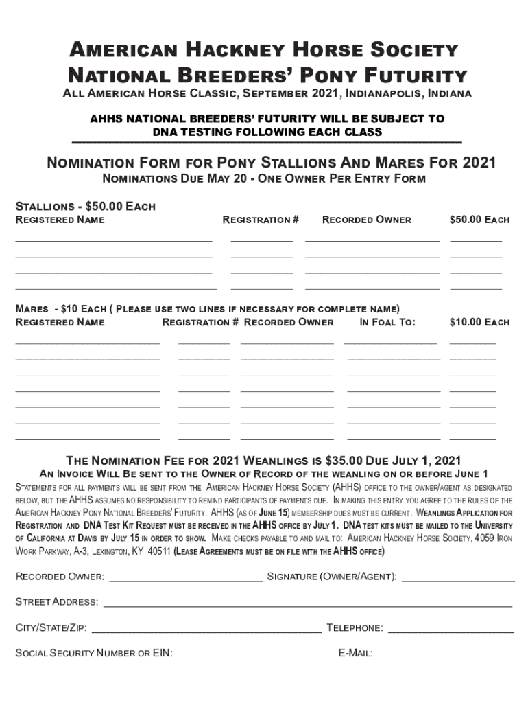 American Hackney Horse Society National Breeders Pony FuturityAll American Horse Classic, September 2021, Indianapolis, Indiana AHHS NATIONAL BREEDERS FUTURITY WILL BE SUBJECT TO DNA TESTING FOLLOWING