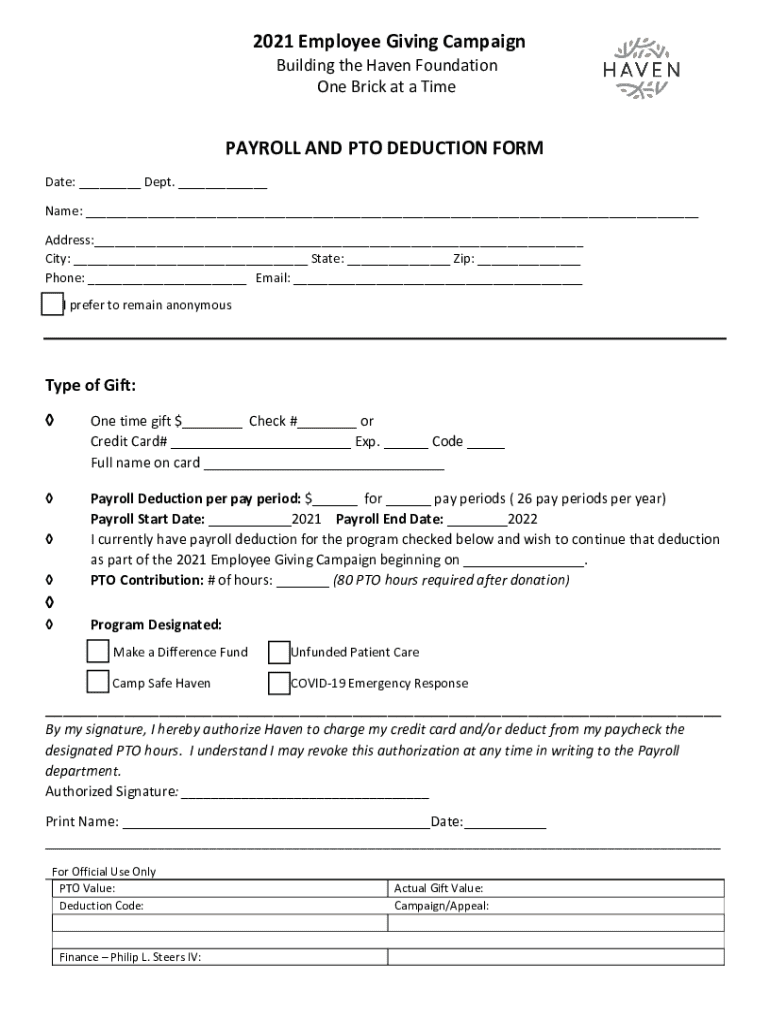 2021 Employee Giving Campaign Building the Haven Foundation One Brick at a TimePAYROLL AND PTO DEDUCTION FORM Date: ___ Dept. ___ Name: ___ Address:___ City: ___ State: ___ Zip: ___ Phone: ___ Email: