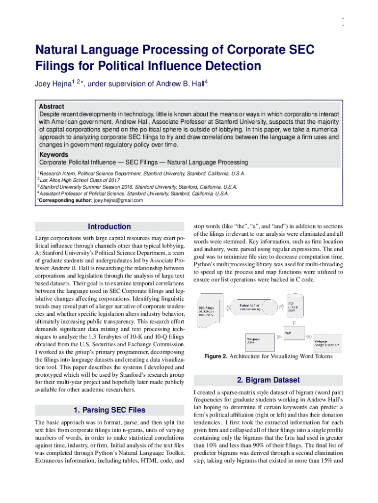. . Natural Language Processing of Corporate SEC Filings for Political Influence Detection Joey Hejna1 2 *, under supervision of Andrew B. Hall4 Abstract Despite recent developments in technology,