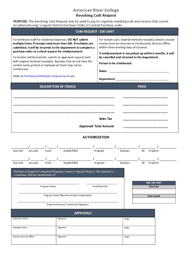 Revolving Cash RequestPURPOSE: The Revolving Cash Request may be used to pay for urgently needed goods and services that cannot