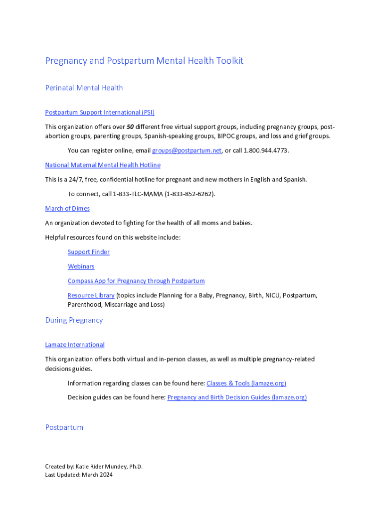 Pregnancy and Postpartum Mental Health Toolkit Perinatal Mental Health Postpartum Support International (PSI) This organization offers over 50 different free virtual support groups, including pregnancy